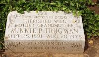 Minnie Trugman died on 28 August 1978 Montifiore Hospital, Bronx, New York, at age 86. She died on the Hebrew date of 26th of Av, 5738. She died after sunset which would calculate to this Hebrew Date.8 She was buried on 30 August 1978 Old Montifiore Cemetery, Queens, New York. Her headstone reads: Cherished Wife, Mother and Grandmother. She had lived to see a new country, raise two children, help with four grandchildren, and meet and love two of her twelve great-grandchildren.9