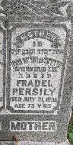 Circa 1931, Fradel lived at 1774 Eastburn Avenue, Bronx, New York; Mechel had died, and Frudel went to live with her daughter Minnie and son-in-law, Sam Trugman.3 She died on 21 July 1936 in New York City. She was buried Riverside Cemetery, Saddlebrook, New Jersy. According to Riverside Cemetery: grave 10184, Frieda Persily, located in Chevra Nusach Sfard of the Bronx. According to Robert Persily's Rabbi, the headstone reads: Here lies buried and honest woman who lived a long life. Fraidie bat Eliyahu Nachman, 3 Menachem Av 5476 or maybe 5477.5